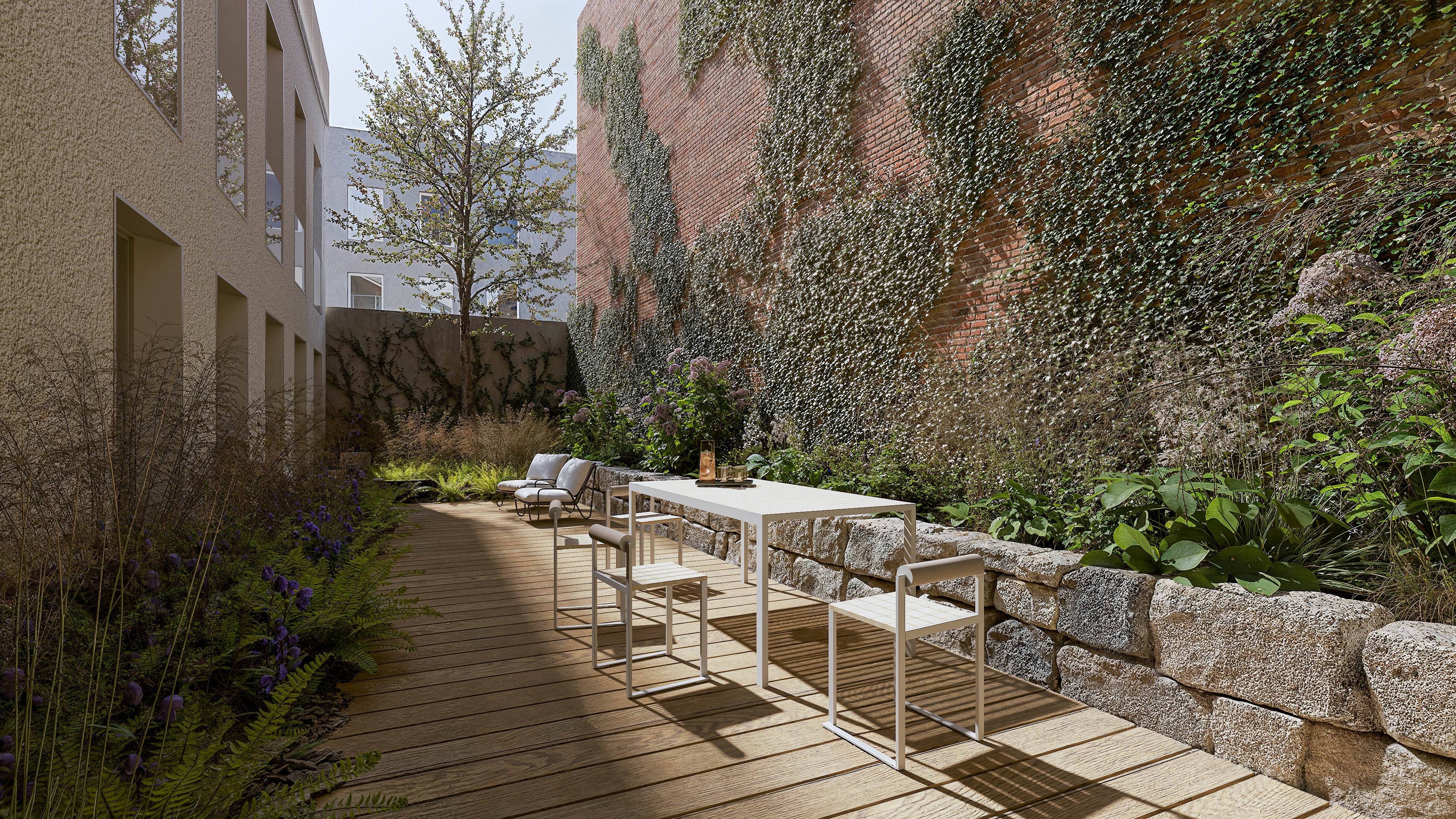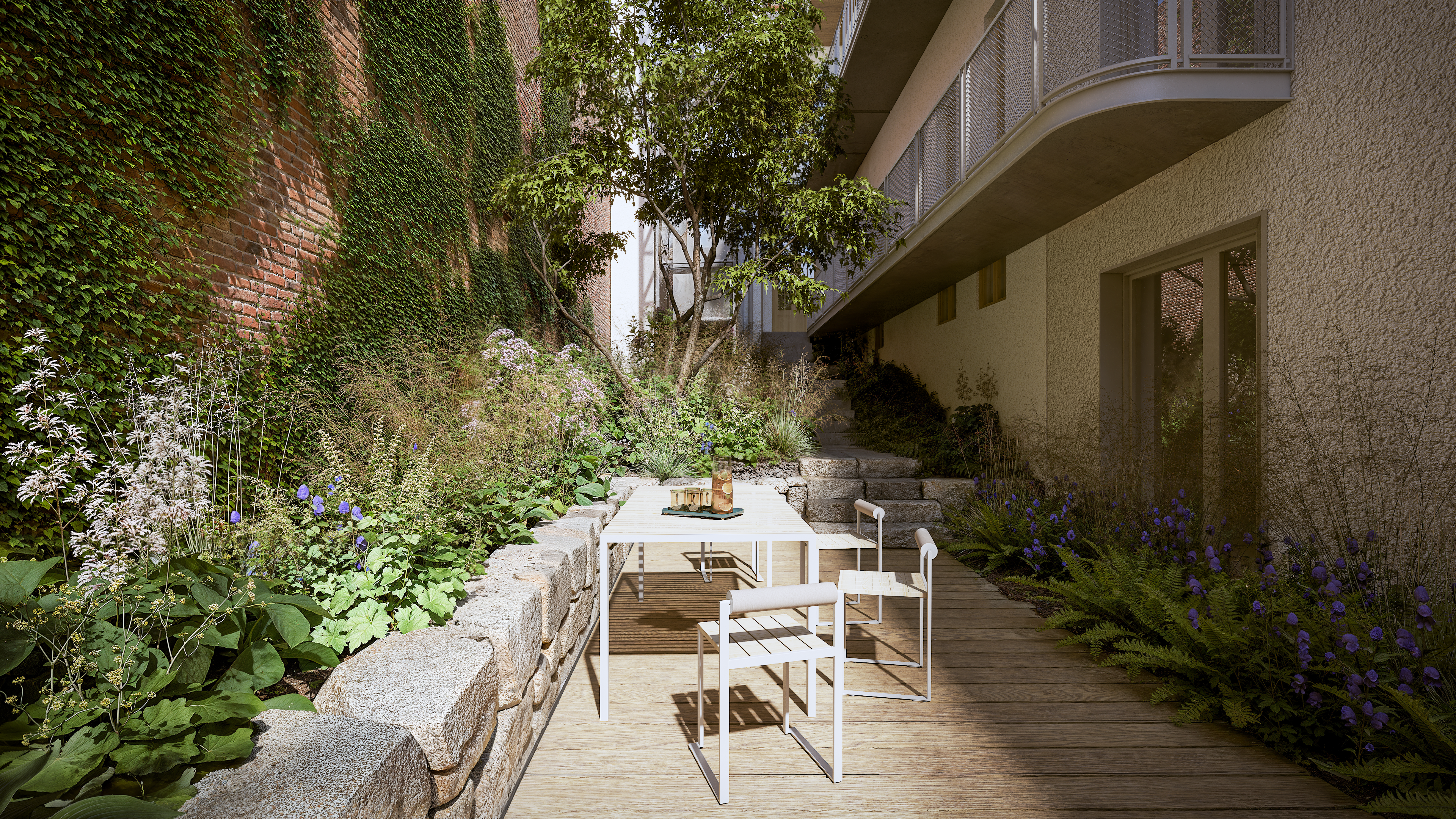 Images of the landscape proposal for the courtyard of a historic house in a historic citycenter in Slovakia.