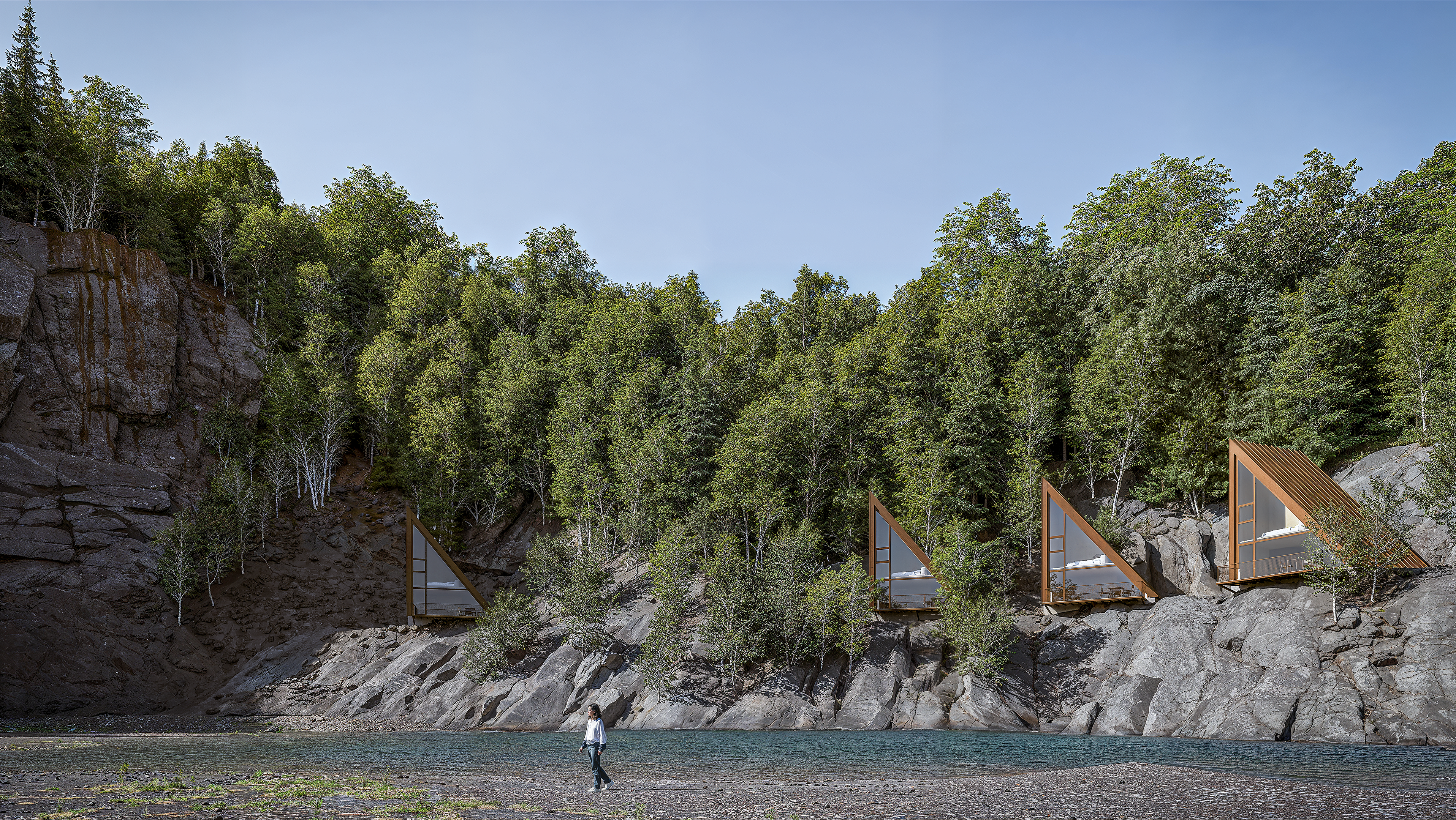 Visuals of modular houses in a flooded former quarry.